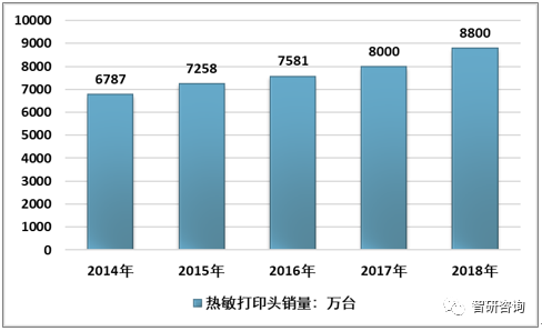 2018 年全球热敏打印头的销售数量预计突破 8800万台,同比增加超过10%,2014-2018年全球热敏打印头销售复合增长率6.71%。