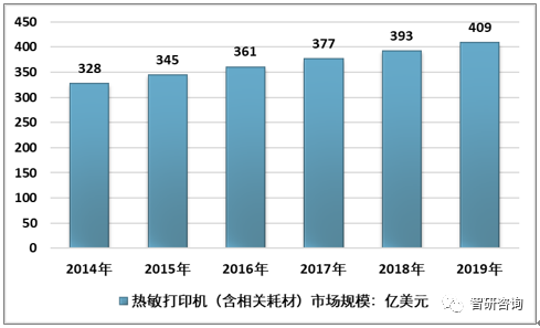 全球热敏打印市场规模(包括打印机及相关耗材)从2014年的328亿美元增长到2018年的393亿美元,预计2019年全球热敏打印机市场规模增长至409亿美元,年复合增长率为4.3%。