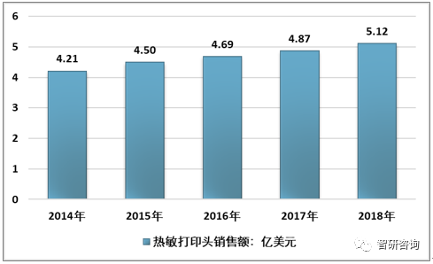 2018年全球热敏打印头金额突破 5 亿美金,同比增加超过5%,从而达到新的历史高峰点。
